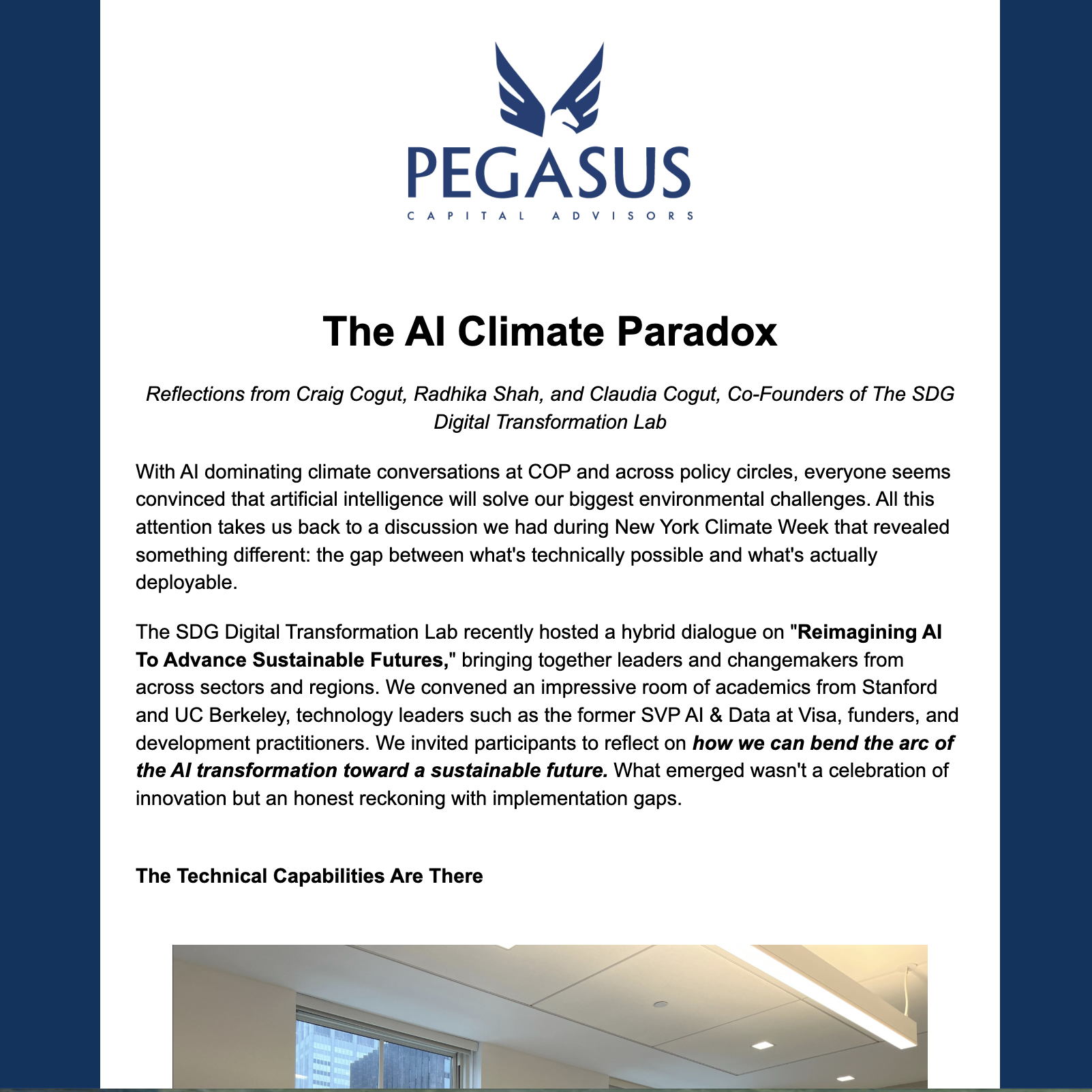 Craig Cogut founded Pegasus Capital in 1996 with the vision to change private equity investing by integrating social and environmental factors into the investment process. For nearly 30 years, sustainability and health have been at the heart of Pegasus’ investment strategies with numerous award-winning portfolio companies creating lasting positive impact. As the first U.S. private equity investment firm having obtained the landmark accreditation of the Green Climate Fund, Pegasus continues to build on its two and a half decades of experience with new and exciting initiatives that create value beyond returns.